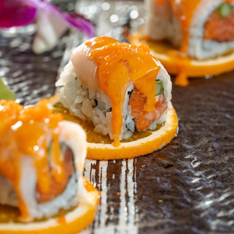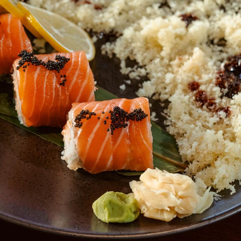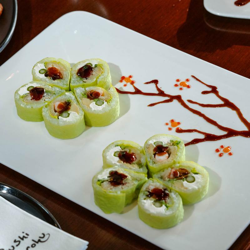 Wrapped with cucumber instead of rice and nori, topped with masago and ponzu sauce.
